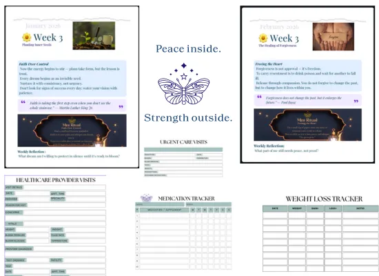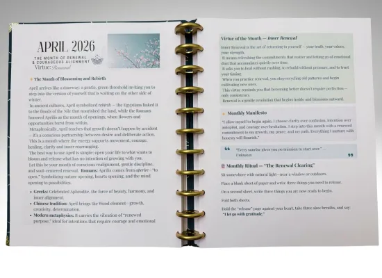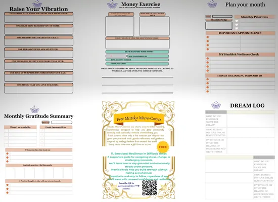 A high-value collector’s calendar and annual companion. Features your unique Birth Chart map, monthly Universe transits explained in practical and friendly language, weekly wellness reflections, and dedicated spaces for manifestation exercises, vision checks, and a Dreams & Sleep Journal.